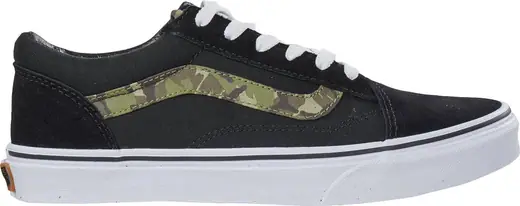 Le design s'inspire de la chaussure Vans Old Skool originale et présente une variante rafraîchie pour les enfants. Ce modèle présente une tige en daim et en toile, avec une bande en V et une languette de couleur camouflage.